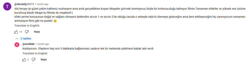 YouTube’daki birçok yorumda da benzer görüşleri görmek, bu konuda yalnız olmadığımı gösterdi. Demek ki izleyicinin ortak beklentisi artık sadece “korkmak” değil, aynı zamanda inandırıcı ve içine çeken bir hikâye izlemek.