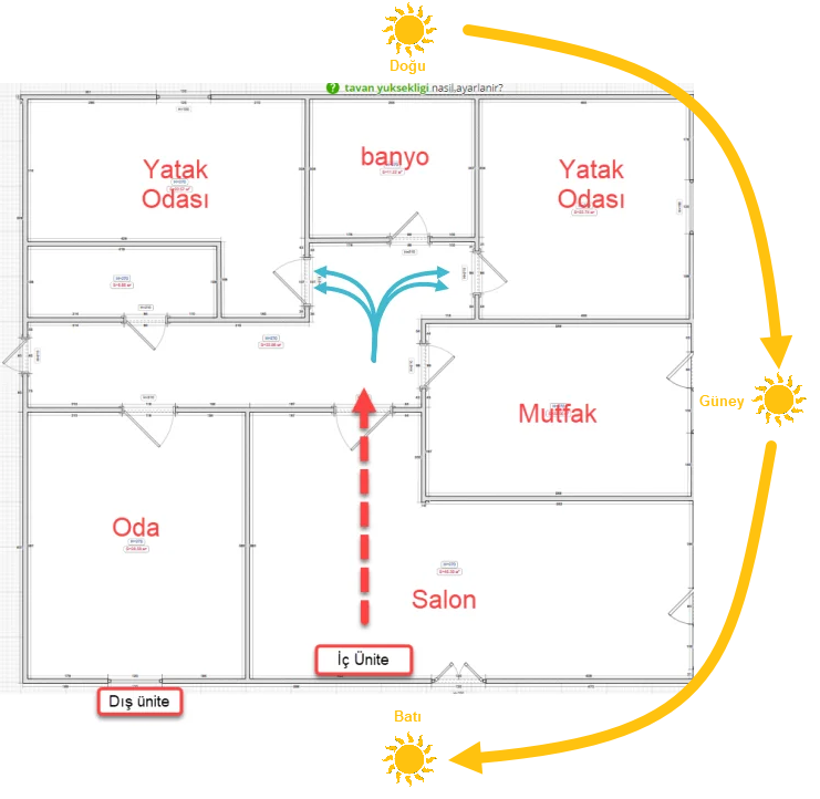 Evin planı ve Kurulumu aşağıdaki gibi gündüz herkes zaten salonda veya mutfakta dolayısı ile 12BTU çatı katı güney cepheye bakan 24-25 metre kare odayı soğutmaya gayet gayet yetiyor.